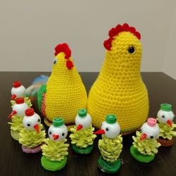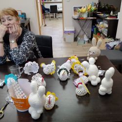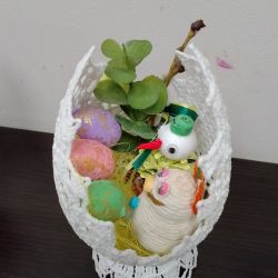 18.03.2024 dekorowanie ozdób - szydełkowe kurki krochmalenie, króliczki z włóczki, kurczaczki z szyszek i malowanie jajek